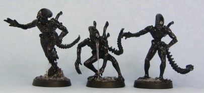 I’ve had these HorrorClix Aliens half finished for ages, meaning they’ve been based and sprayed black. The required very little work to finish. A couple of layers of drybrushing, some black ink, glue for Alien gunk effects, a coat of gloss varnish and what do you know, three more Xenos to fill those motion trackers. The HorrorClix Aliens are very nice for the painter. They could basically be used as is, but with a little work you can make them even nicer. They’re the only models that I don’t dull down with a matt varnish after gloss varnishing.