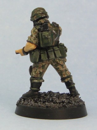 Cayman Green over a black basecoat, followed by a thin coat of GW brown ink. Then squiggles (ah, what a word!) with Graveyard Earth and some unknown GW/Coat d’Arms dark green from the 80s/early 90s. Basically any dark green will do. I kept the camo pattern on the armour larger than on the uniform.