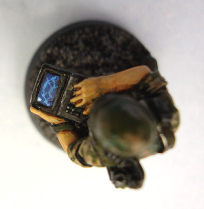 I think I nailed it pretty well, and overall I’m really satisfied with how the model turned out. I even made an effort to get the motion detector right. There’s a motion blip there, probably just a little girl. The model is sculpted by Mark Copplestone and can be found in the Copplestone Castings Future War range, in the pack FW22.