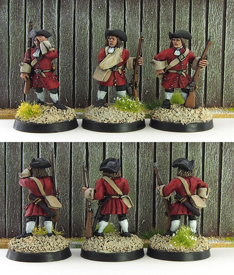 However, and creating a bit of a conflict, despite this approach I have a tendency to strive for some internal coherence. Even if I’m not too concerned with exact accuracy, there has to be something to tie it all together. In this case I think of two things: one is the idea of the redcoat, and the second is a sort of historical explanation. The idea of the redcoat is simply that in my mind the defining visual characteristics of the 18th century British soldier are the tricorne hat, the red coat and the musket, and everything else is fairly irrelevant detail. The historical explanation is a bit more fudged (obviously, as the game isn’t set in a fixed year), and basically focuses on the idea that troops in the backwaters of the Caribbean will have older gear, whereas fresh troops shipped in from England or the American colonies will have crisp and more modern gear. There you have it, I sort of had to get it off my chest!