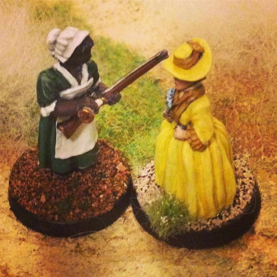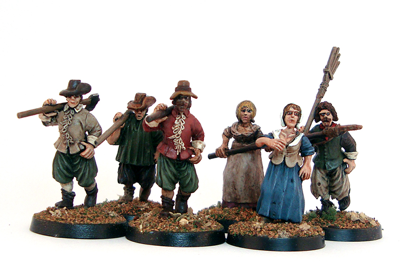I have most of the minis I need for the scenario, but they need painting. First up are these innocent villagers. They’re actually English Civil War civilians by Redoubt Enterprises, so historically they’re off by a century or so. However…I don’t really care. I’ll just say it’s a really rural colony, and some of its people are very traditional. I originally bought the miniatures to add to my Warhammer Fantasy Empire army, and they’ve been sitting in the cupboard for ten years or so, I think. I was really happy to give them an airing and finally slap some paint on.