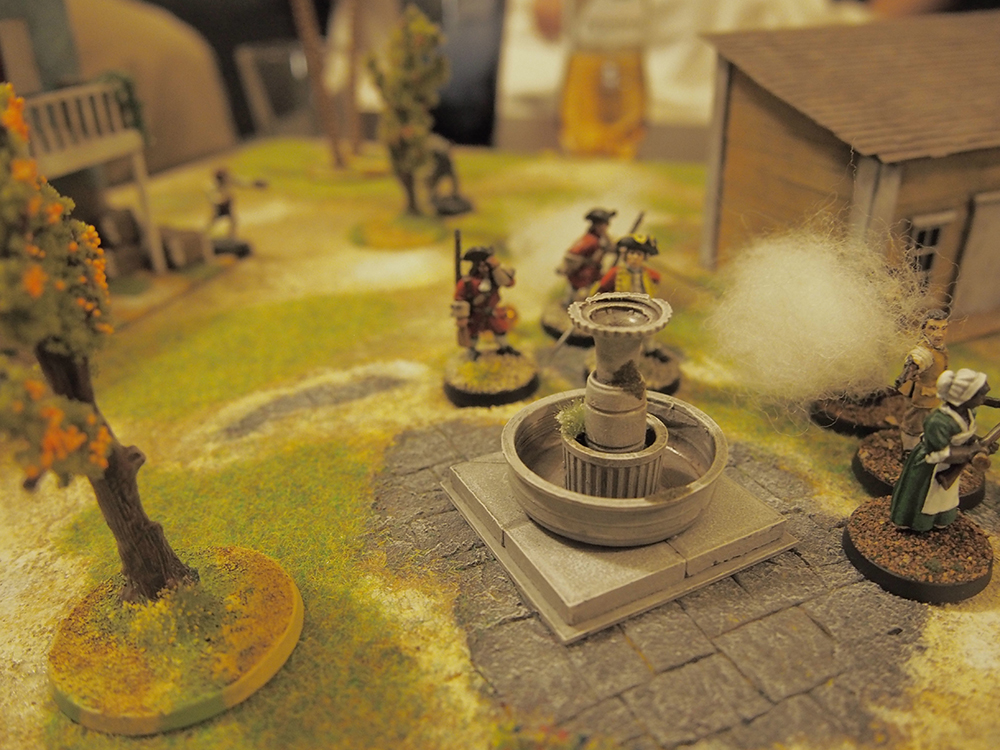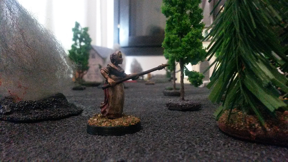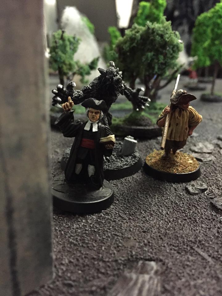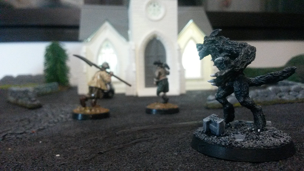 The game featured an unlucky town somewhere around New England in the 18th century. Every year this town gets attacked by monsters on Halloween. It’s not that big of a deal, some towns have to deal with drought, some with Indians, some with monsters, and at least the monsters attack only once a year. The scenario was very simple, with an endless stream of villagers streaming towards the village church from the edges of the board, monsters trying to catch then and five villagers armed with muskets trying to drive the monsters away. There were some bonfires scattered around the table, making life more difficult for the monsters and weakening them in combat if they got too close, with the church and the priest having a similar effect. The game lasted for 12 rounds, or the twelve tolls of the church bell on witching hour. The system we used was a simplified and streamlined version of Ganesha Games’ Fear and Faith, utilising the Song of Blades and Heroes engine.
