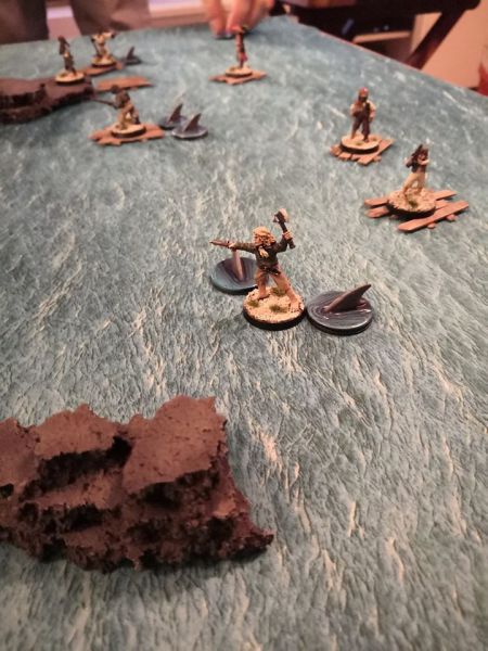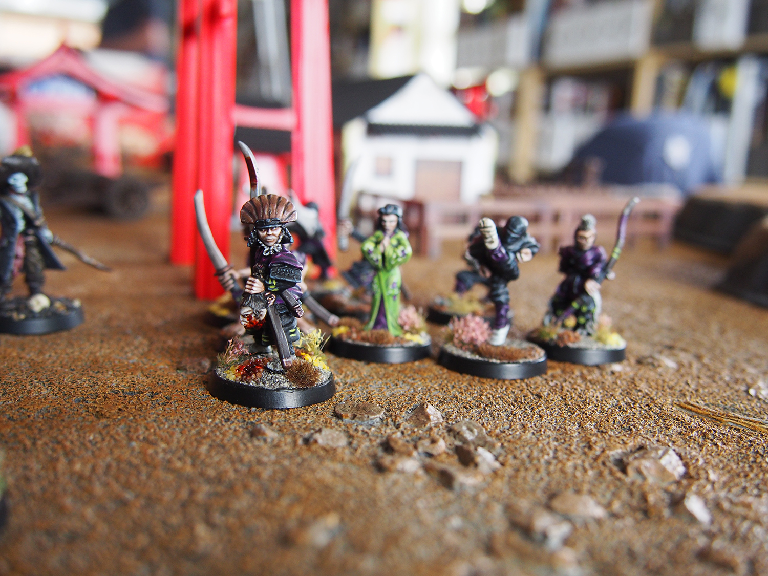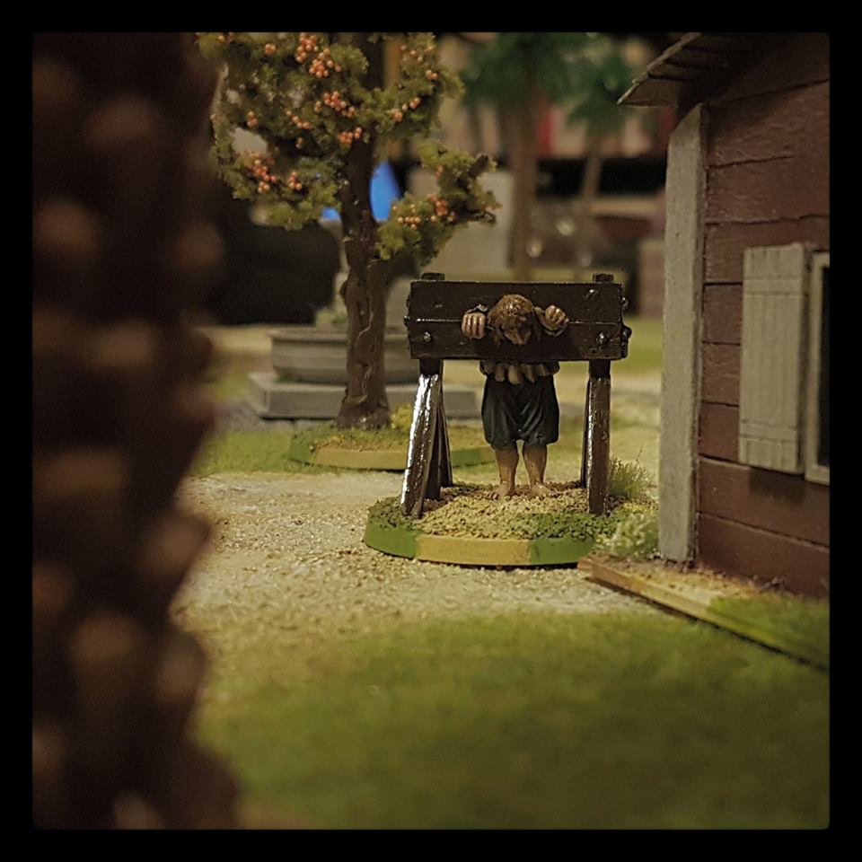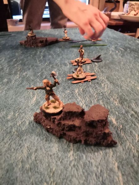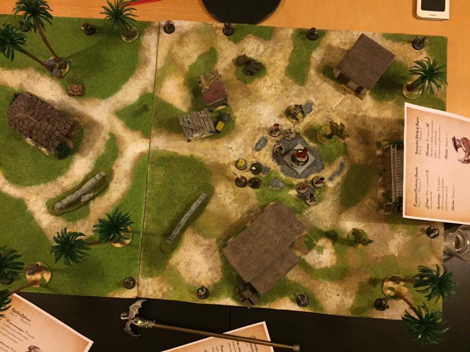 The game was a great opportunity to lay out my new gaming mat from Deep-Cut Studio, a double-sided mat with dark grass on one side and a cobblestone pattern on the other. It was also nice to dig out some of my houses and scatter terrain. Even my own printed pieces made an appearance! For once we remembered to take a bunch of photos, some of which are shown below. Hopefully they convey something of the fun we had. To further boost the atmosphere, we had a nice soundscape from myNoise in the background – I use it for most of my gaming as well as writing – with tropical birds and insects chirping, and tribal drums pounding. I highly recommend stuff like this to boost your gaming experience!