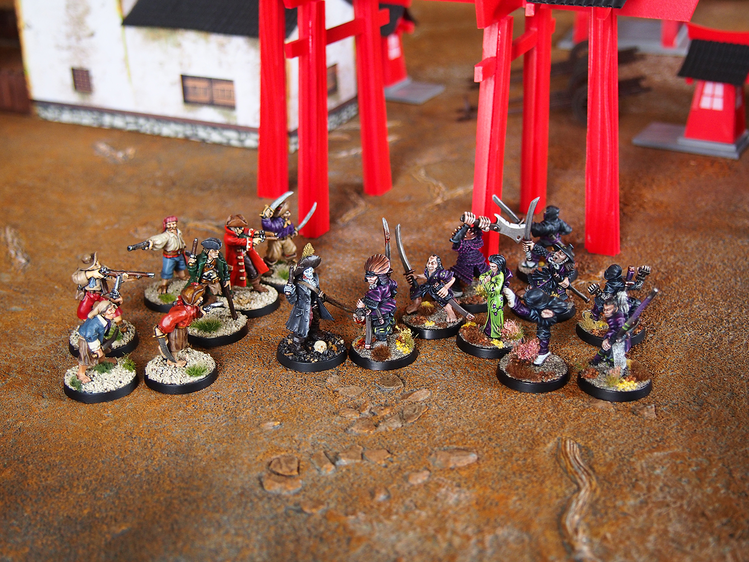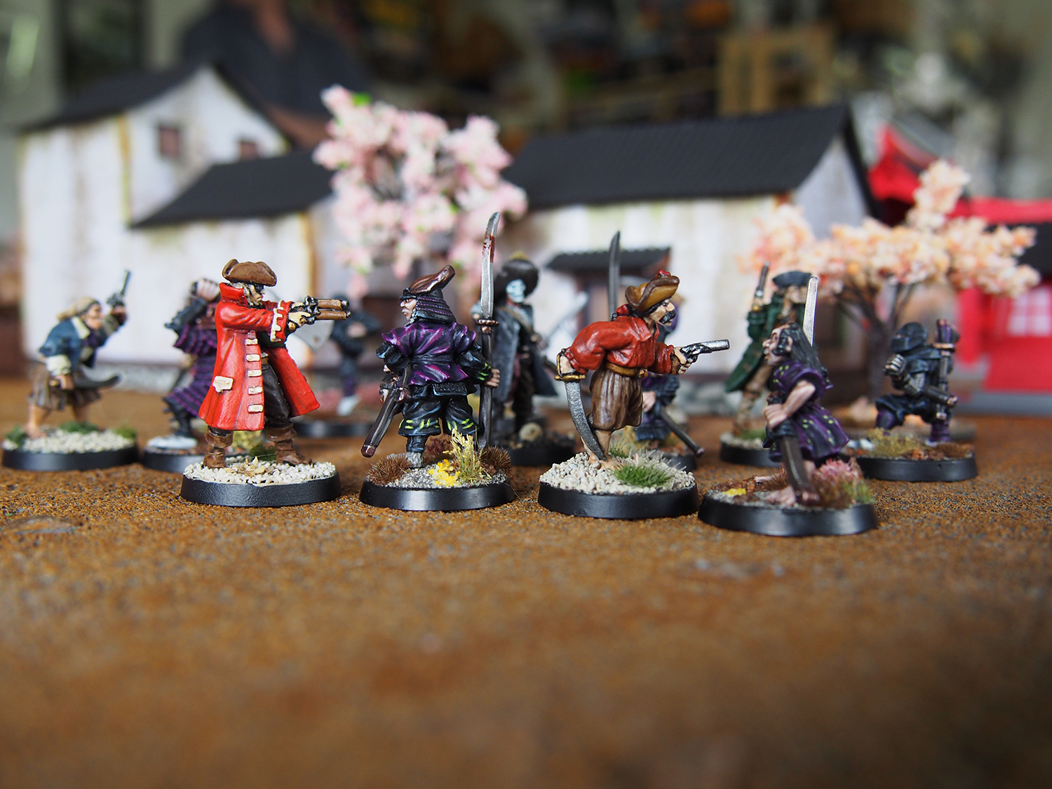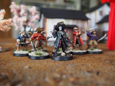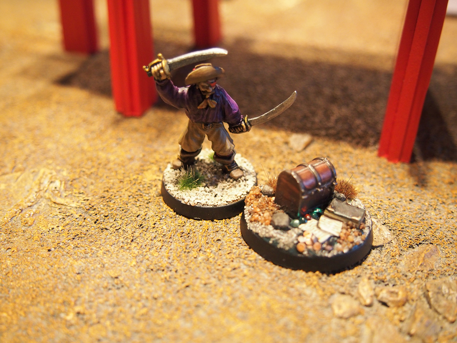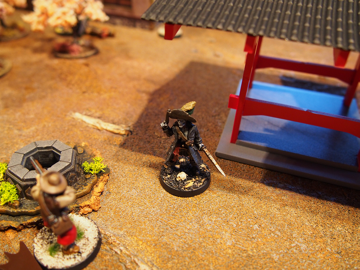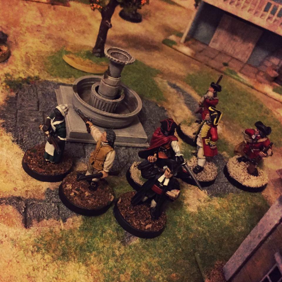 Putting together a game to play with my friends, I went with my go-to ruleset, Flashing Steel by Ganesha Games. I tweaked and simplified it at places for ease of gaming, and then wrapped it in a nice little cocoon of story. The story was a suitable genre piece, with the dread undead pirate captain Armitage Shanks (last seen bothering the Orient) coming to claim charming young Rosalie Underwood for his bride for all eternity at the strike of midnight. To make things easier for him, Shanks decided to bring along an army of the dead as well as two horrible, imaginatively named lackeys, Ghost and Crab man. Luckily a group of heroes was there to thwart Shanks’ evil scheme! The protagonists consisted of dashing captain Pemberton Smythe and his two redcoats, pirate queen Valeriana de Torres with her voodoo priestess Madame Labadie and first mate Benson, Rosalie Underwood’s father with his priestly friend Father Wexcombe and trusted servant Belinda, and Daring Dragoon, the people’s swashbuckling hero.