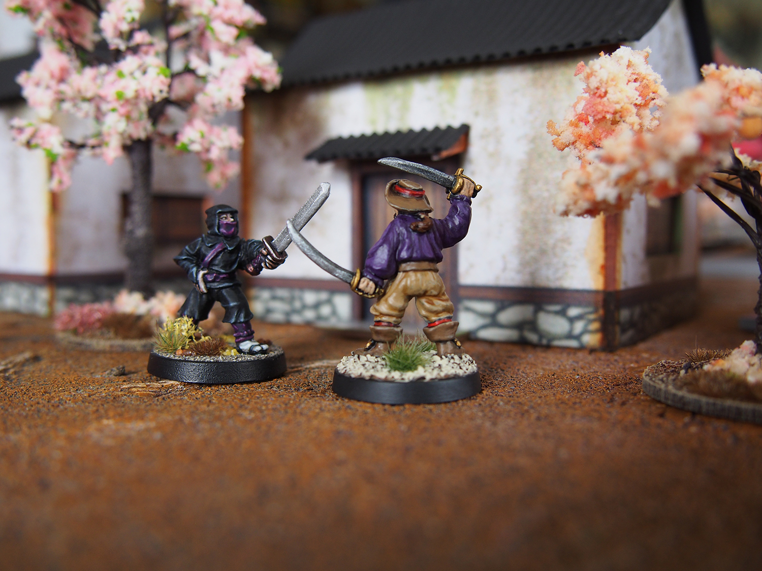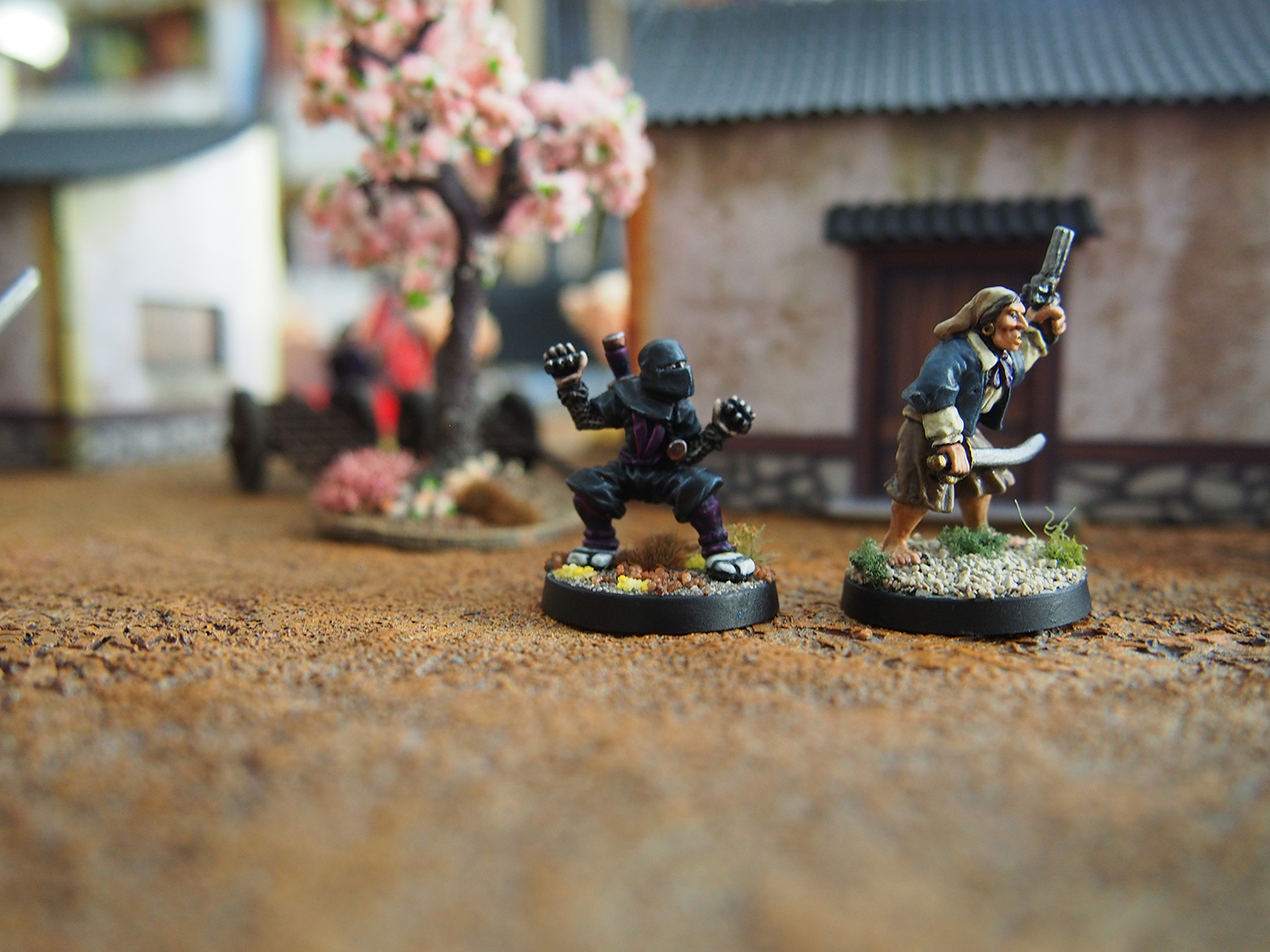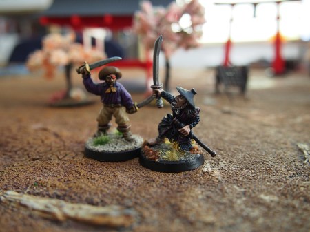 They were pretty quick paintjobs, hence the groupshot that handily hides some mould lines and rough painting. I especially need to single out two minis, however, and they’re the disheveled lady in the back row and the red coated gentleman in the middle. Both were painted by my girlfriend, and they’re her first and third mini, respectively, with the first one painted a long while back. I based the minis with a mixture of green and brown flock, with assorted pizza herbs thrown in. I think they make for a nice autumn look, and are generic enough to be used in different settings. The minis themselves are actually quite nice, with separate weapons and heads on some. They’ll work nicely as village farmers and woodcutters not only in the Halloween game, but in fantasy and pirate games as well.