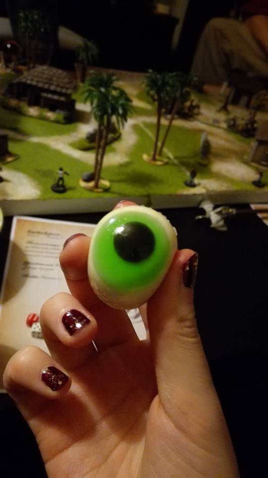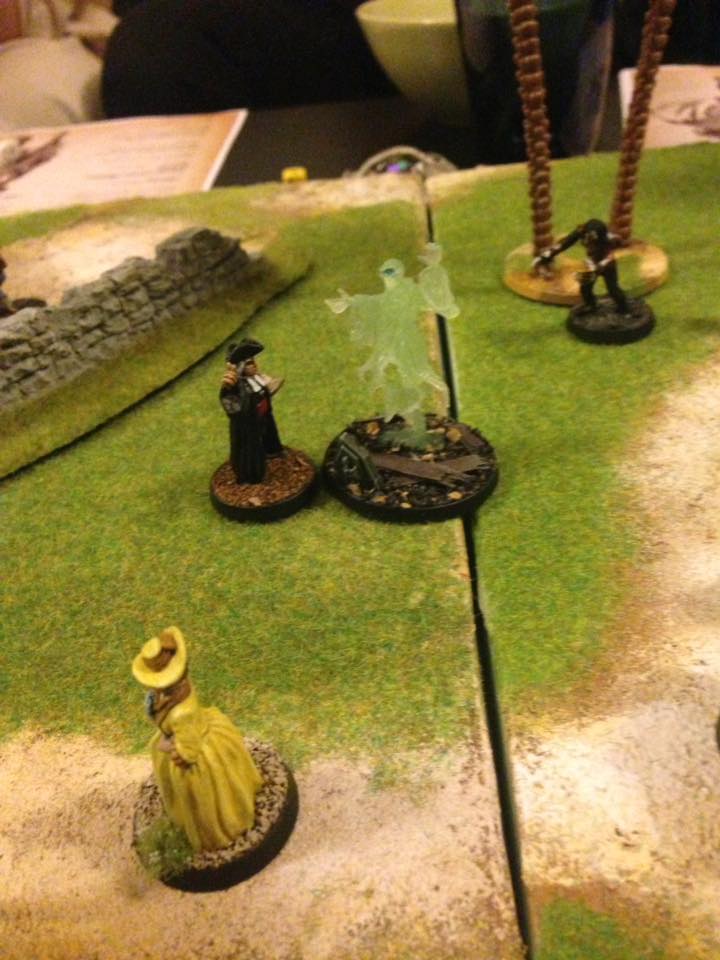What followed was an epic battle, with poor Rosalie’s fate hanging in the balance almost up to the last dice rolls of the game. What did we get to see? Our heroes cut down waves upon waves of zombies. Father Wexcombe banishing the ghost with holy water, only to get shot down by Shanks just moments later and brought back as a zombie. The terrifying Crab man crushing poor Daring Dragoon after the hero’s valiant charge. The pirate queen and His Majesty’s captain fighting side by side to buy more time before falling to the claws of Crab man and Shanks’ blade. The voodoo priestess dueling magically with Shanks, pulling the enchanted Rosalie this way and that…and finally, first mate Benson putting a pistol bullet in Shanks’ skull just as the witching hour passed and the forces of darkness withdrew.