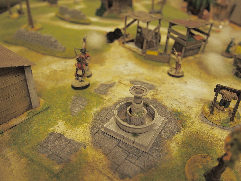 I wanted to use my pirate minis, and as we’re both very much into history (and social history especially), we wanted an interesting, historically plausible scenario. What we decided on was a plantation slave uprising. I quickly came up with a basic scenario which we then embellished further, adding special rules and so on. The core idea was that the (former) slaves would win if they either managed to set six plantation buildings on fire, or kill or capture the planter, while the planter’s overseers and hired hands tried to subdue the revolt. The planter had two bodyguards, and as one of them happened to be dark skinned, we decided that there was a possibility of him siding with the rebels – but to retain game balance, he was not allowed to shoot the planter or set the planter’s house on fire, due to some remnants of ingrained loyalty to the planter’s family. There was an endless stream of hired hands as they made their way on the table from nearby plantations, making the scenario a race against the clock for the rebels – while they started with a considerable advantage in numbers, eventually they would be overpowered.