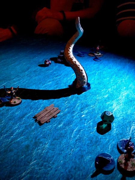 The game itself was surprisingly good, if I may say so! The mechanics functioned really well, it was a close game in the finish, and everyone seemed to have a good time. There was even talk of maybe developing it further and turning it into an actual game. Who knows – I’ve long wanted to publish a game. Pirates were knocked off their rafts and eaten by sharks and the Kraken took the ship’s boy. As usual, shown below is a collection of photos taken by the players, I hope the feel of the game comes across!
