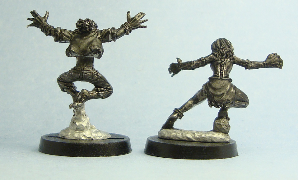 The female is in a dynamic pose as well, but her stance is somewhat confounding. Is she springing to the side or is she just crouching there with one foot on a rock, or has she just landed there? I have no idea. Fortunately the weirdish pose manages again to convey the feeling of a vicious predator. She looks fast and threatening, and her snarling visage and large hands enhance the look. She wears a corset, a torn skirt and fingerless opera gloves. She also has an anklet and a necklace. Even more than the male, this model can be used in many many different time periods. She’ll fit right in as a modern day goth, a Victorian harlot or a wild west saloon girl.