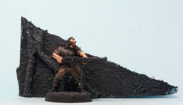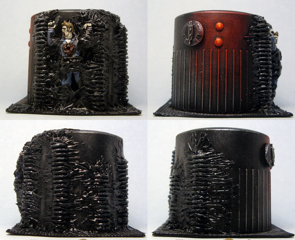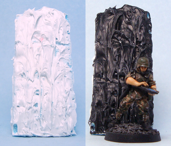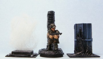 Alien gunk. This gave (and might still be giving) me a hard time. While I love the biomechanical Xenomorph look, it’s a bastard to recreate in larger quantities. Ready-made resin sets exist, but that would rapidly escalate the costs of this project – something I definitely don’t want. My current choice is to go with Tetra paste, which is a somewhat elastic paste for sealing windows, bathroom tiles and the like. This doesn’t produce a neat, organic surface, but rather a creepy, gooey one. It can be crudely shaped and takes paint well. Below is a quick mock-up using a blue foam offcut and some paste. On the right you can see the same piece with a quick, patchy paintjob (black with grey drybrushing, ink wash, I’ll later add some strands of glue for that sticky look) and a Marine to give you an idea of how it looks. Definitely let me know what you think. In my opinion it looks nice enough, even if it is a slight departure from the source material.