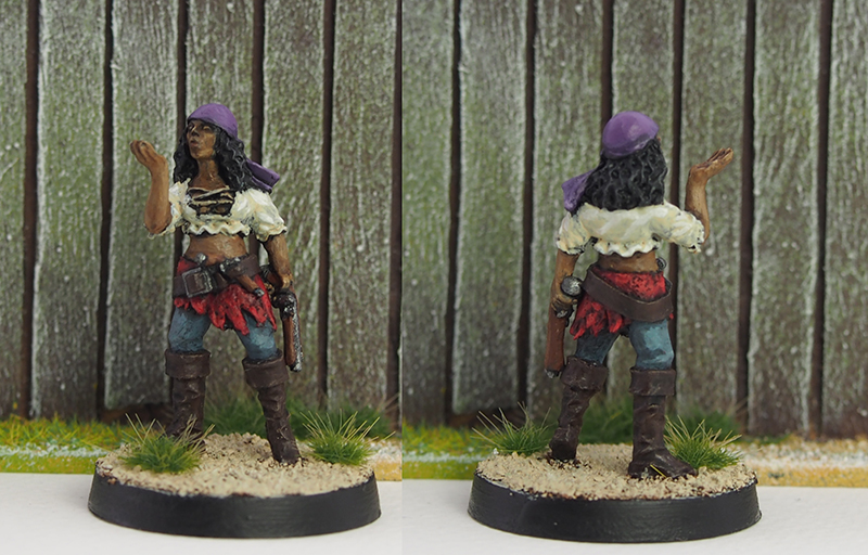 On the left is a female pirate from Bad Squiddo that I bought on our visit to CRISIS in Antwerp in early November. While she’s pretty much on the borderline of almost being too fantasy, she’s just suitable enough. A lovely sculpt in general, her hair looks weirdly unfinished which gave me a bit of a headache. Are those ribbons? Dreadlocks? In the end I just painted everything as hair. That gripe aside, she looks very menacing and has a sweet Jack Sparrow/Black Sails Anne Bonny mash-up vibe. The axe is brutal, too. The miniature is also a great example of a non-sexualized female pirate miniature, we definitely need more of those.