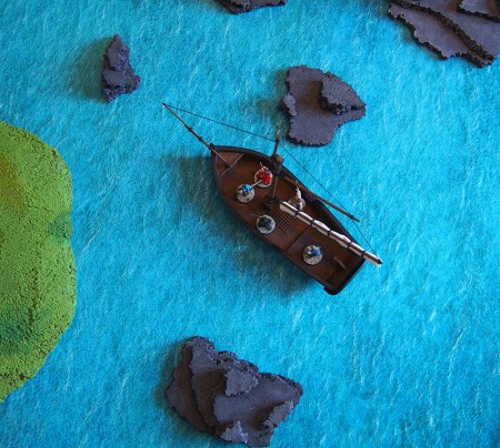 After doing plenty of googling and window shopping, I ended up looking at Deep-Cut Studios’ custom mat printing service, Print-O-Mat. I was overjoyed, now all I needed was a suitable image, and surely one would be easily available. How wrong I was. As is apparent in hindsight, you need a very big image for a quality print, and I was going for a 3x3ft map – roughly 90x90cm to fit my small table. While there are beautiful stock photos of Caribbean waters, you need a very high resolution for a high quality mat. After spending hours searching through various photo archives both free and commercial, I settled on something especially designed for the purpose: a printable battle mat image from Tiny Worlds. A bargain at $4.50, it suited my needs wonderfully. While it was also very blue, purchasing it as a file meant that I could simply use Photoshop to tweak it to my needs. I edited the colour balance to make the mat more green to evoke the correct genre feel.