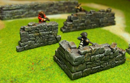 These are really useful gaming pieces, so I figure’d I’d show you a couple of shots with figures. The walls and ruins fit wonderfully into my Caribbean setting, but would definitely not look out of place on any fantasy or even modern table.