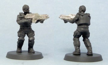 The models are pretty nice sculpts, although some of them suffer from overly long arms. A few also succumb to the action figure syndrome by firing their rifles with one hand. As with the Fenryll troopers above, I find this more than a bit silly. The sculptor Chaz Elliott has managed to pose the troopers in good, dynamic poses, so they really look like they’re in a combat situation. They’re quite bulky and heroic in style, resembling the Copplestone Castings range for example. There are some multipart models, and the pieces fit together okay. All the models stand on fairly thick integral metal bases and due to the wide stances some of them have, basing them on standard 25mm bases will require some cutting and filing of the bases.