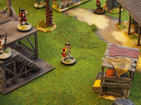 One of the governor’s footmen keeps an eye on the pirates making landfall