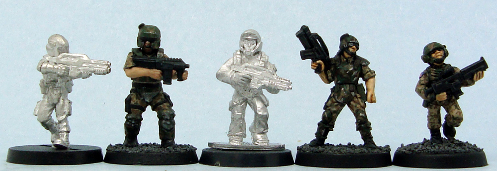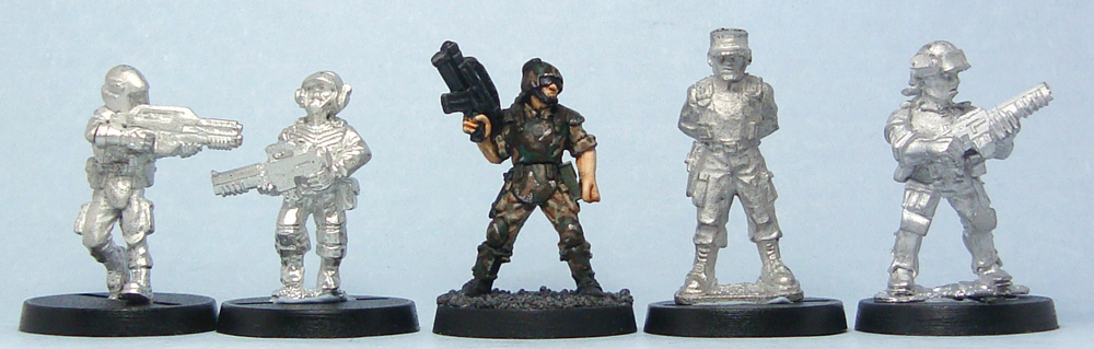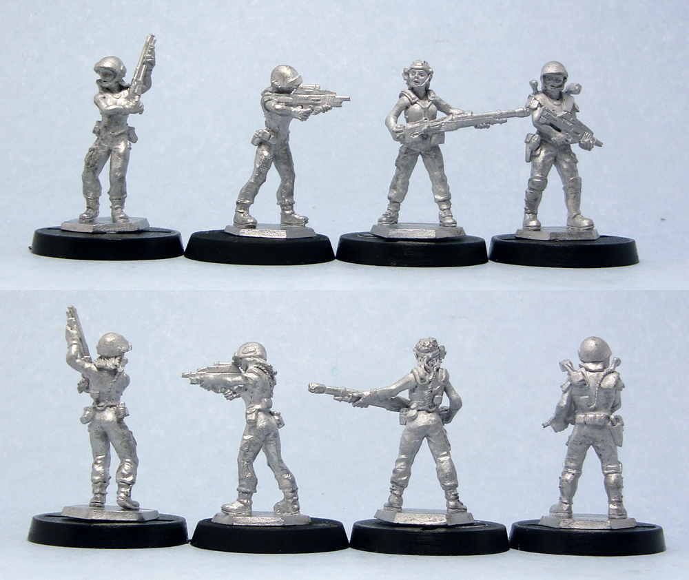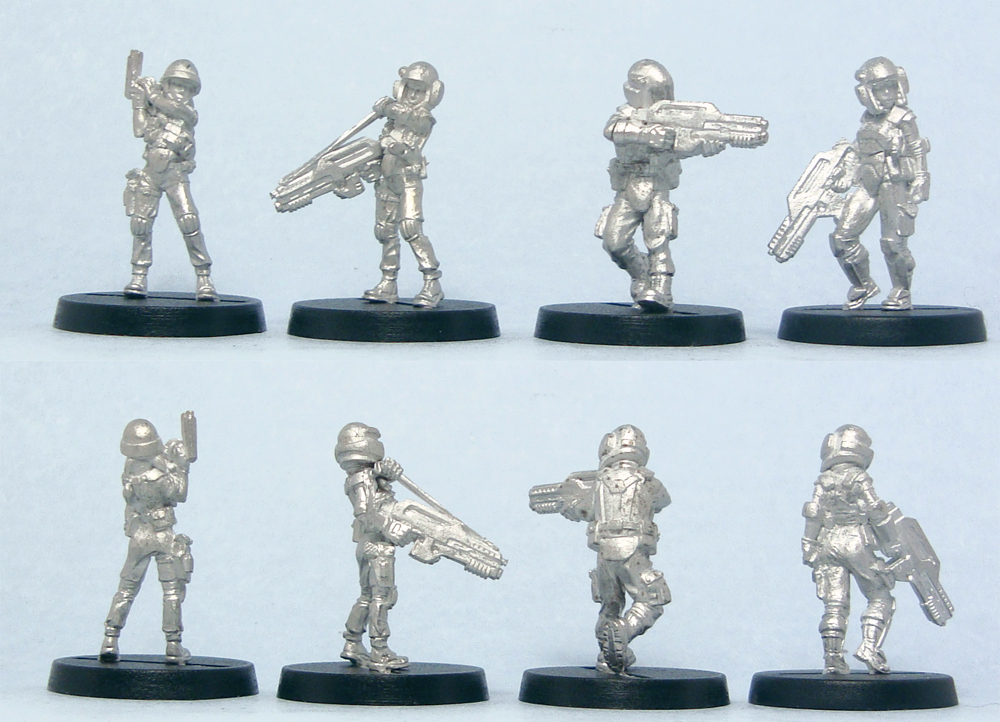 Mark Copplestone has sculpted loads and loads of futuristic not-CMs, and they’re sold through at least three different companies. Copplestone’s own company has a wide range of around ten packs of five miniatures each. All kinds of troopers are available, with different gear options and weapons. There’s a pack of five female troopers for a nice piece of variety, as well as specialists and officer types. The sculpts are clean and paint up nicely, and the casting quality is fine as well. The models stand on small, thin integral bases.