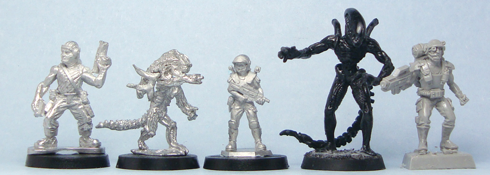 The size comparison pictures should give you a pretty good idea of the miniatures’ size differences. As you can see, they’re not too bad. Note that some height differences depend on the models’ integral bases, which I’ve simply slapped on top of a 25mm slottabase. The pictures should function as guidelines, but keep in mind they’re not The Truth. They weren’t taken in laboratory conditions, after all. It would’ve been too much work to photograph every single combination of different manufacturers, so I figured you can simply compare different images. There are some Aliens for size reference in some of the pics. You can click on any picture for a larger version.