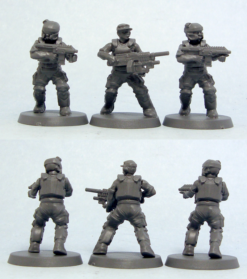 I’d give the models a 7 or an 8 out of 10 on casting quality. The detailing on the guns and the torso armour is pretty nice and crisp, but there are some bad softness and mould line issues on the legs. While the quality is better than on the em4 plastics (which are what, 20 years old?), it’s definitely not as good as with Games Workshop or Mantic. This is basically my main complaint about the set, as crisper casting would’ve made this set wonderful instead of “just” very nice.