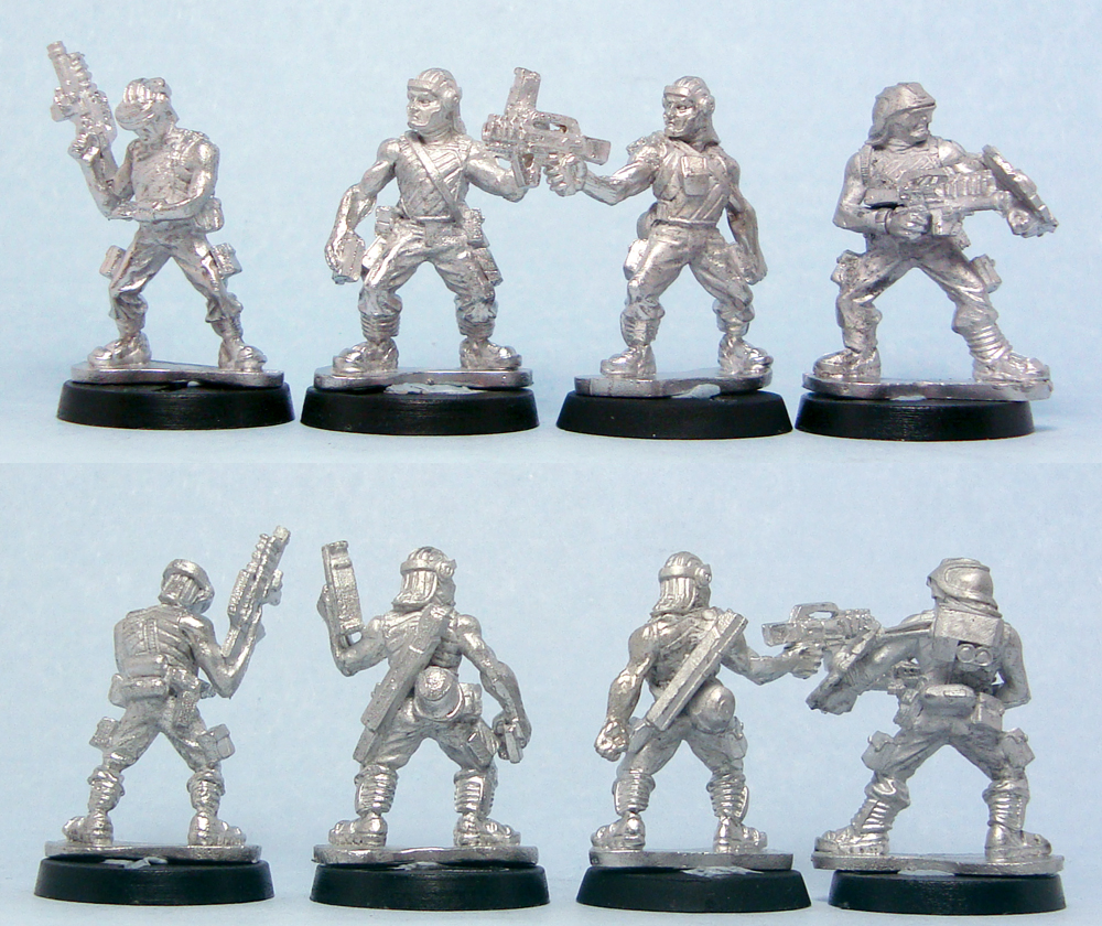 The models are pretty nice sculpts, although some of them suffer from overly long arms. A few also succumb to the action figure syndrome by firing their rifles with one hand. As with the Fenryll troopers above, I find this more than a bit silly. The sculptor Chaz Elliott has managed to pose the troopers in good, dynamic poses, so they really look like they’re in a combat situation. They’re quite bulky and heroic in style, resembling the Copplestone Castings range for example. There are some multipart models, and the pieces fit together okay. All the models stand on fairly thick integral metal bases and due to the wide stances some of them have, basing them on standard 25mm bases will require some cutting and filing of the bases.