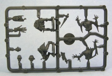 The sprue contains two ghouls, with two different lower and upper bodies. There are three optional heads and three hands with different weapon options – a long dagger, a cleaver and a Freddy Kruger-ish claw thing – plus a bag with a hand and foot sticking out. Sorry for the picture quality, these were a bugger to photograph so I settled for less than perfection.
