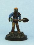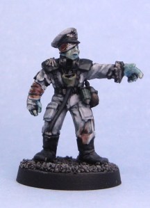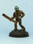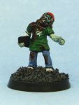 Step 5: Use a very thinned down black ink (again, I use GW’s) to accentuate some shadows (as in step 4, the eyesockets are important, as are cheekbones) even further and generally ”dirty up” the zombie. The deeper shadows give the zombie a more menacing, gaunt and even deader look. If you want to use the black ink to add some splotches of dirt to the zombie’s clothing, now’s a great time.