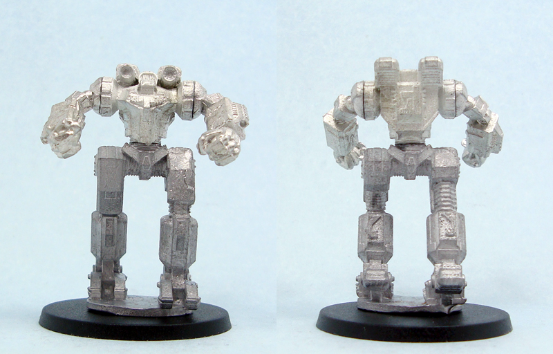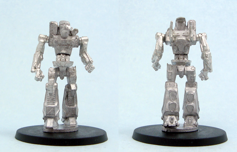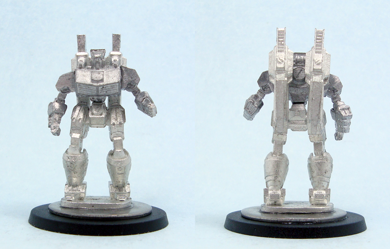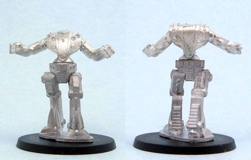 The first impression I got from Hemi was “lanky”. With a fairly short torso and long legs, it reminds me of an ent from the LotR movies. Of course this ent is metal and has a pod of six rockets on the right shoulder, which makes a slight difference. There are also four barrels/vents on its chest, a searchlight on the left shoulder and two fins on its back. There’s something very menacing and purposeful in the design. Hemi is roughly 46mm tall.