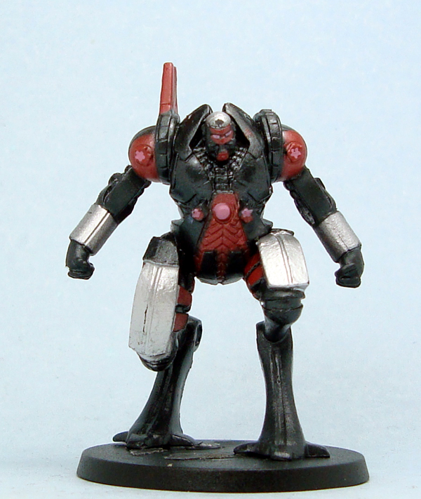 Waraxe is the tallest of the models reviewed, at a whopping 56mm. As the name suggests, the mech carries a large axe. No, seriously. It’s a giant robot wielding a giant axe. How’s that for awesome! In addition to its namesake axe, the robot has a shoulder cannon as well as another gun in its left hand, reminiscent of a tonfa (aka nightstick). It has a slimmer build than Dauntless, and to my eye it looks a lot like a cylon from the new edition of Battlestar Galactica. The shoulder guards on Waraxe bug me a little bit, as they’re completely flat on the inside lending them an unfinished look.