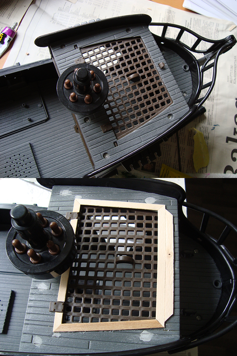 The only problem was that I didn’t have a carriage for the gun as the original mount was a field one, not suitable for ships. Having grown more accustomed to working with plasticard and coffee stirrers, I figured I’d try my hand at building the carriage from scratch, resulting in this: