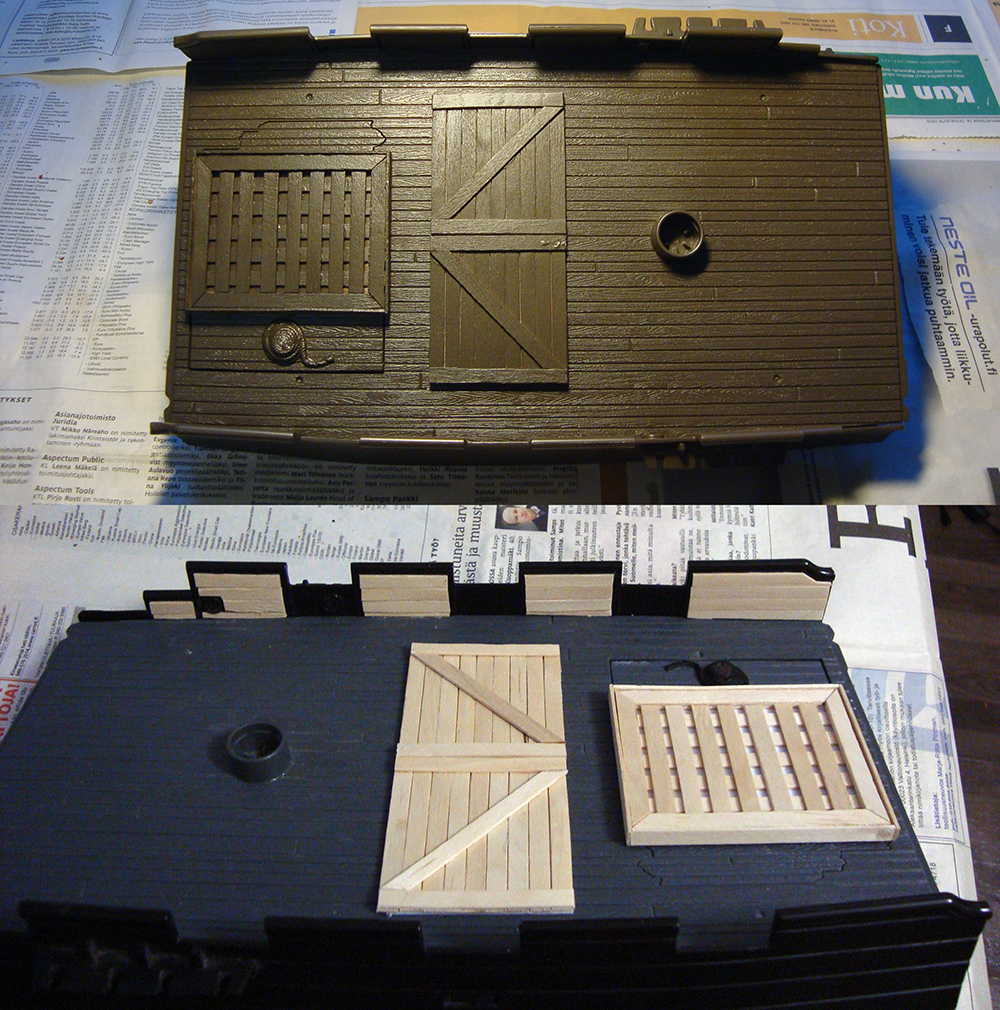 It turned out alright, I think! Sure, anyone into things like history and realism will probably find plenty of things wrong with it, and there are some irregularities here and there, but to my fantasy pirate eye it looks as it should. The core structure is plasticard with an old Warmaster base underneath. The wooden bits are coffee stirrers, the wheels are cut from 10mm diameter dowel rod and the axles are decorative studs meant for clothing. The smaller iron rings are plastic pieces from the original cannon set and the bigger ones are from WHFB orc weapons. As with a lot of my woodwork, this one also relies a lot on the “it’ll look nicer once painted” factor, but I have high hopes!