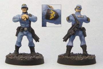 I think the photo very nicely demonstrates the benefits of a unified colour scheme. The fifteen Marines above look like a unit. Look a little closer, and you’ll see there are big variations in body proportions, style and gear. The models in the picture above come from no less than seven different manufacturers (em4, Copplestone, Prince August, 1st Corps, Denizen, Hasslefree and GW), and yet the simple paint scheme and unified basing tie the models together nicely. There are a lot more CMs waiting to be painted, but these guys and gals are a good start.