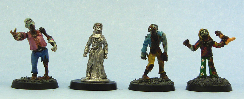 I liked the variety of the sculpts, as well as the nice gender distribution. Three of the eight miniatures were female, one of the five males was a child. There were some nice specialties to stand out from your horde, namely the clerical types, the surfer, the biker and the punk rocker and the cop…basically everyone apart from #1. Sizewise the models fit perfectly with other 28mm manufacturers, being of average build. See the size comparison below for reference.